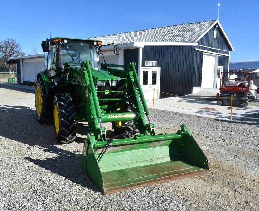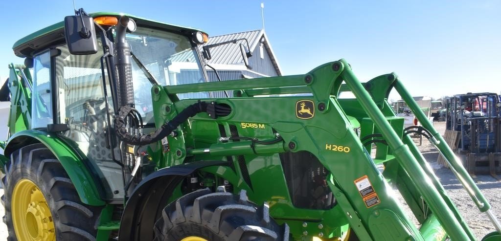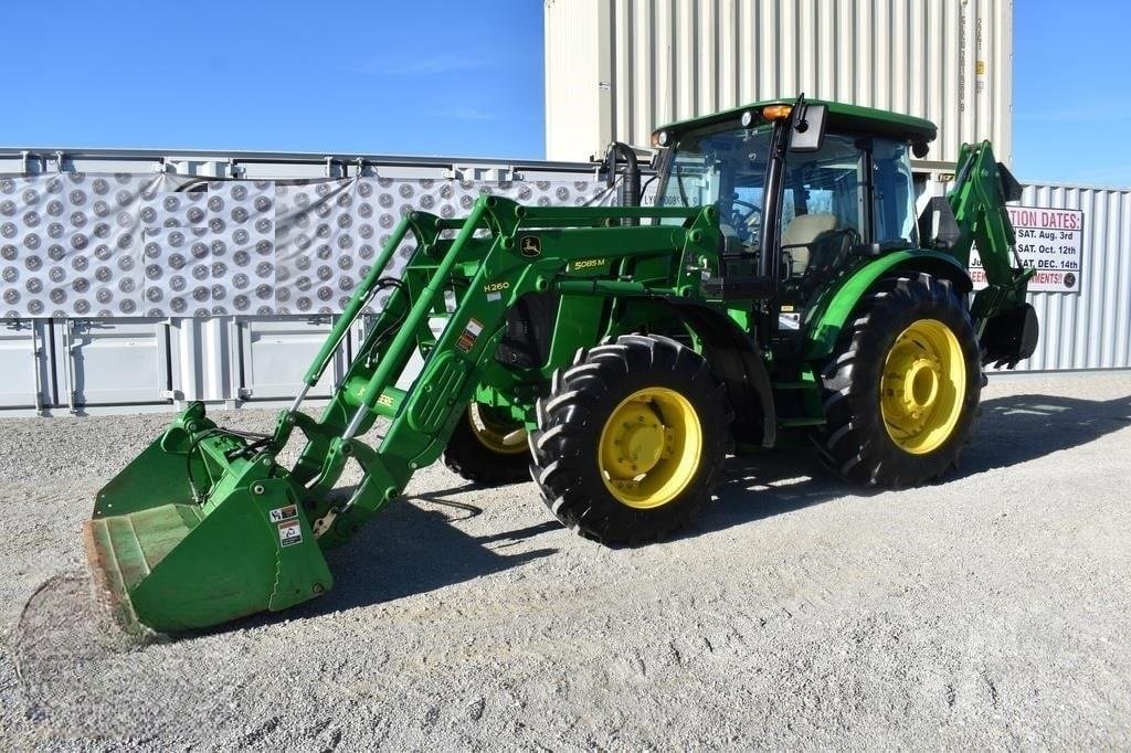 This 2014 John Deere 5085M is a well-maintained, versatile utility tractor with only 416 verified hours. It is equipped with a John Deere H260 front loader featuring a clamshell bucket and a lift capacity of 3,600 lbs, making it ideal for material handling and farm work. The John Deere 595 backhoe attachment offers a 12.5 ft digging depth, 18-inch bucket width, and stabilizing outriggers for efficient excavation.